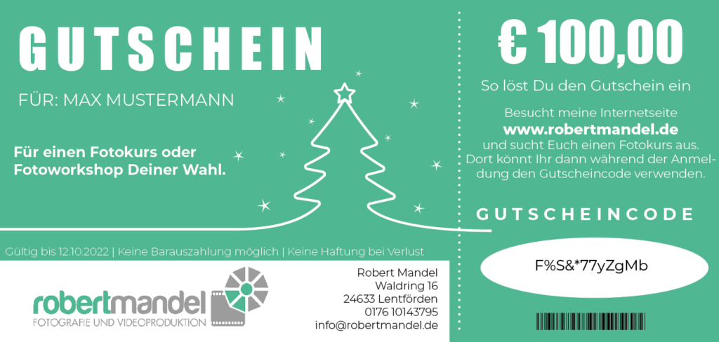 Mit dem aufgedruckten Gutscheincode, kann er ganz bequem online für die Buchung eines Fotokurses auf meiner Website eingelöst werden.
